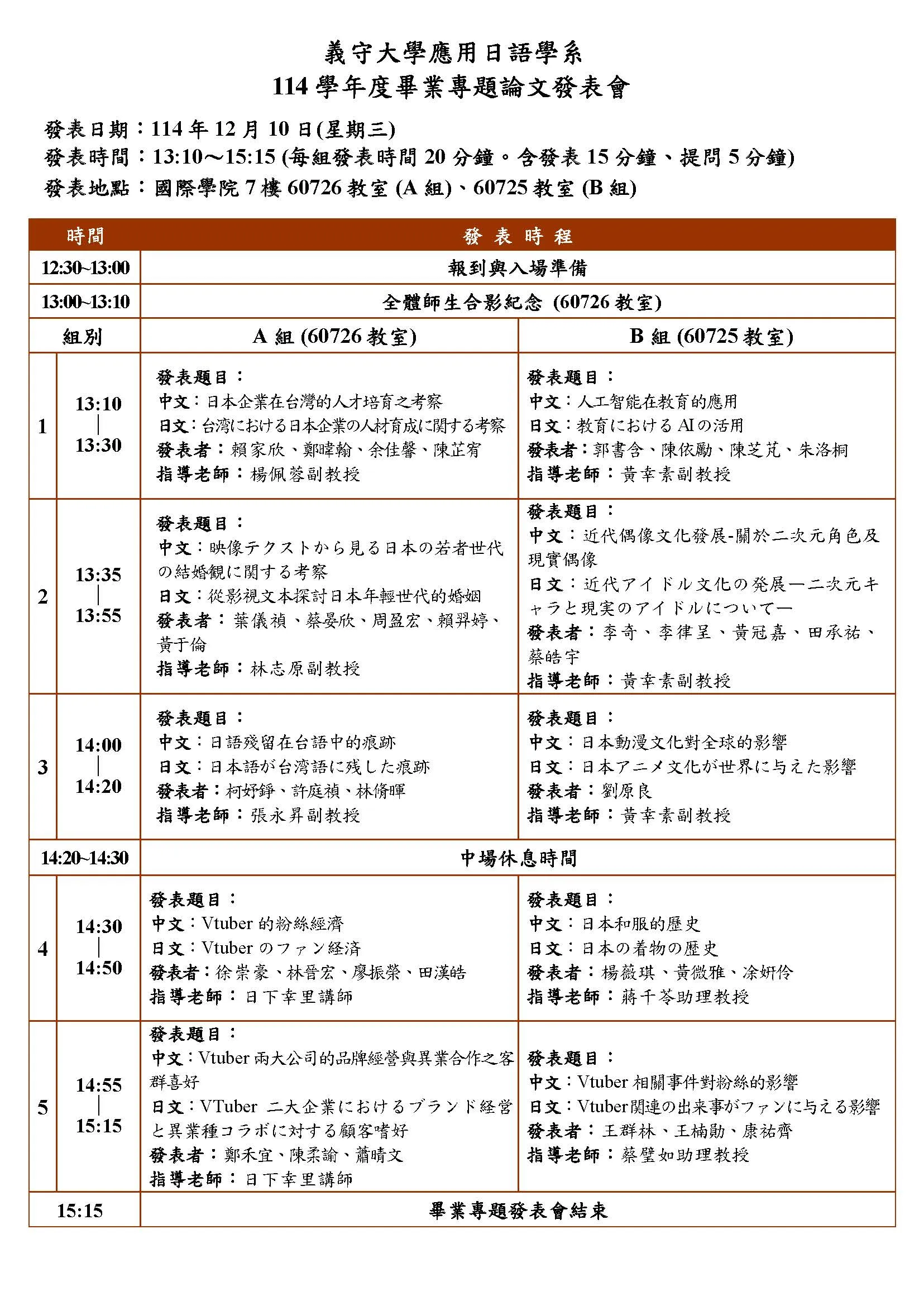 114學年度應日系畢業專題發表會時程